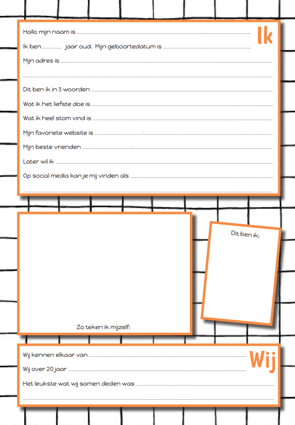 In het begin van het boek kan je een foto van jezelf plakken en op de eerste bladzijden zelf de vragen invullen. Vervolgens kan je vertellen over jullie als groep. Daarna kunnen al je vrienden over henzelf vertellen .