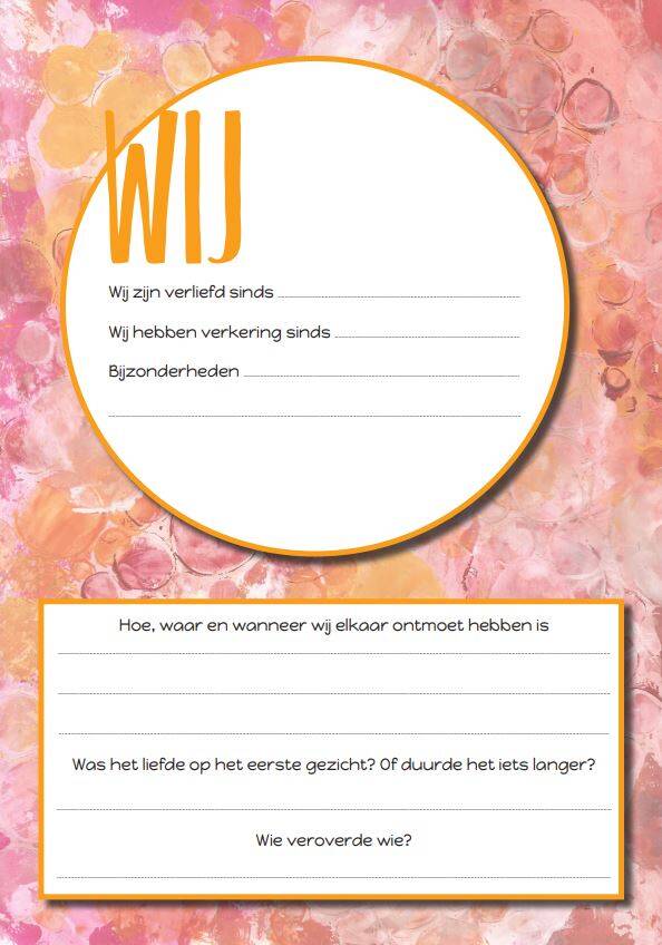 Het boek begint met jullie samen Wij om vervolgens eerst te vertellen over jouw partner Jij en daarna over jezelf Ik. Tot slot is er alle aandacht voor jullie liefde voor elkaar. Al jullie eerste keren dingen doen samen, vakantie, kerst etcetera, maar ook wat jullie nog willen doen samen. Er komen regelmatig lieve woorden en mooie spreuken tussendoor.